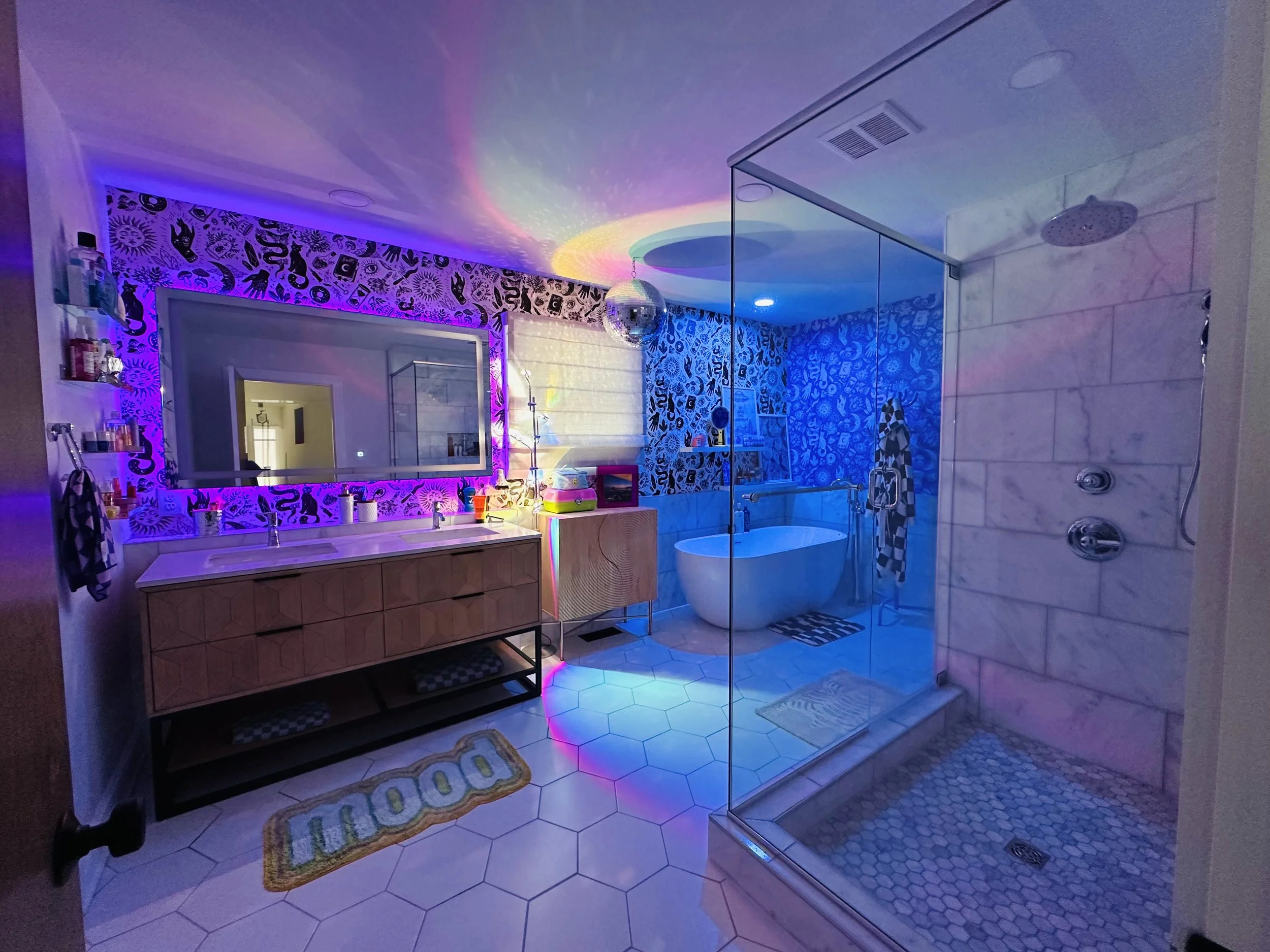 There’s a first time for everything, and this was the first time I incorporated a disco ball into the lighting plan for a bathroom remodel. This was an adventurous client! The project was so much fun, and the finished transformation hit the mark she was looking for.